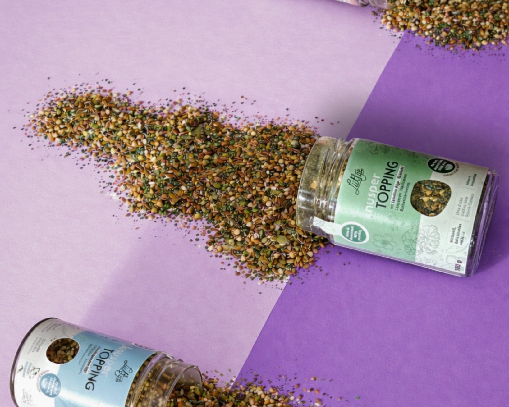 Unseren Feldsalat mit Ziegenkäse und selbstgemachter Himbeervinaigrette haben wir mit dem Himbeernusspulver verfeinert. Das Pulver ist reich an Ellagsäure und so fein, dass es sich ideal in viele Gerichte einrühren lässt. Eine leckere Variante für einen tollen Grillabend.