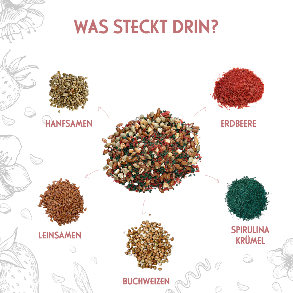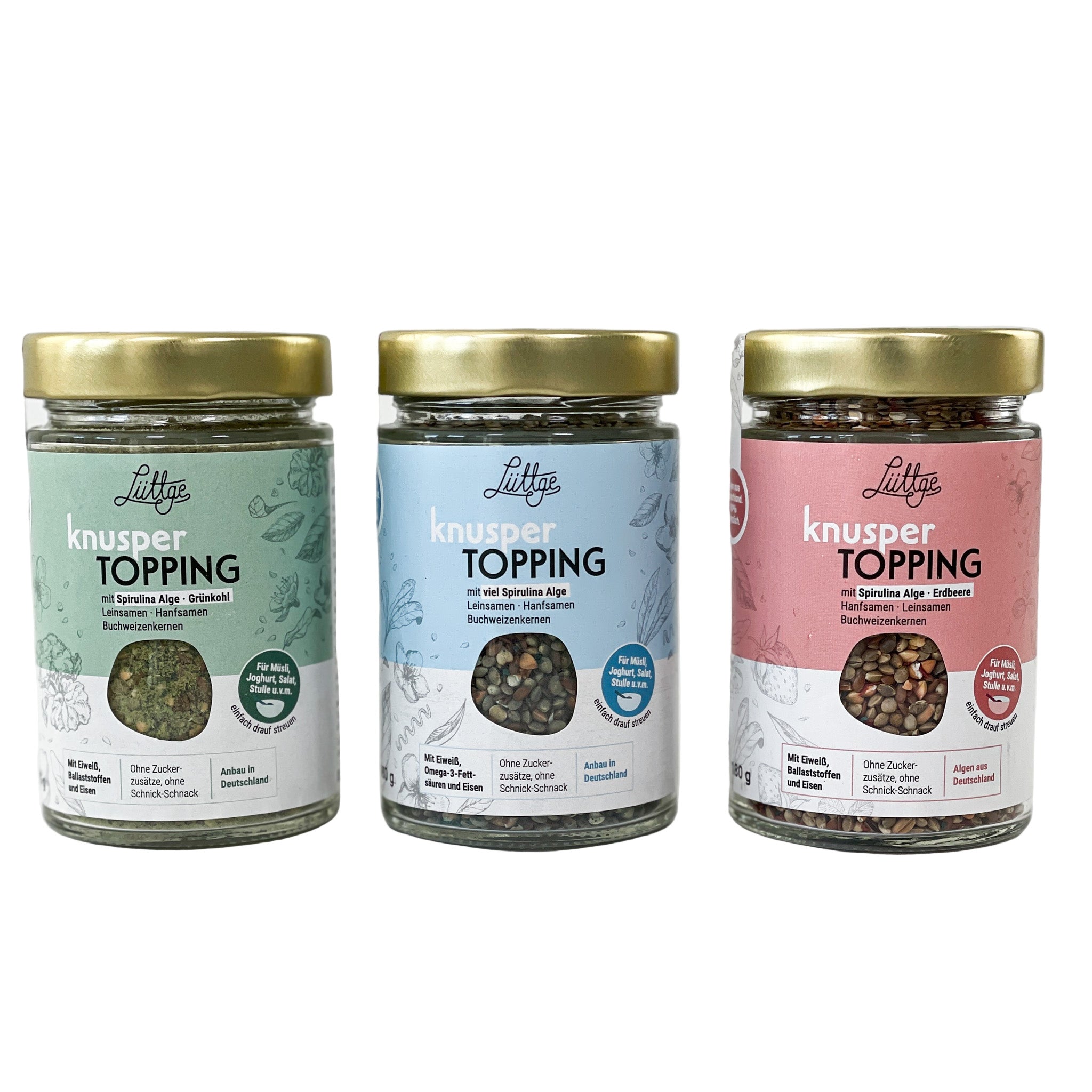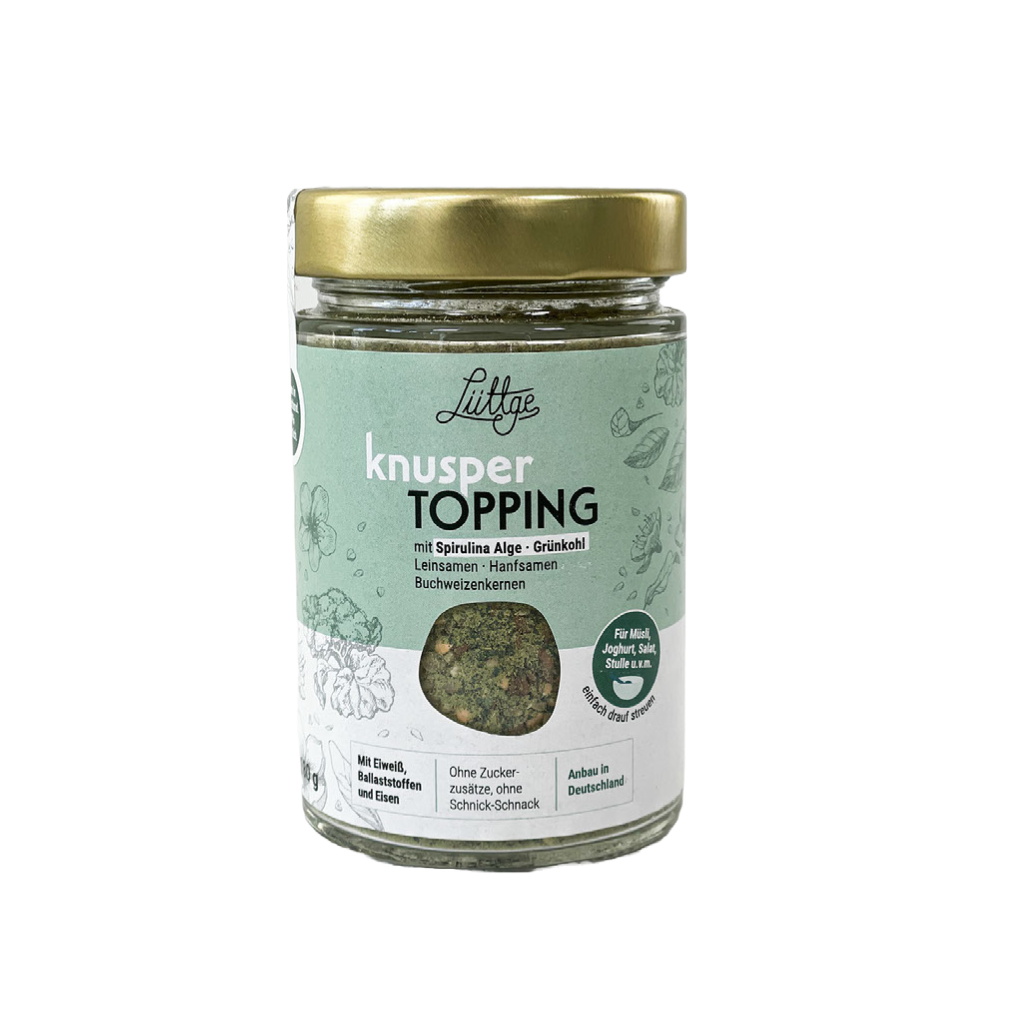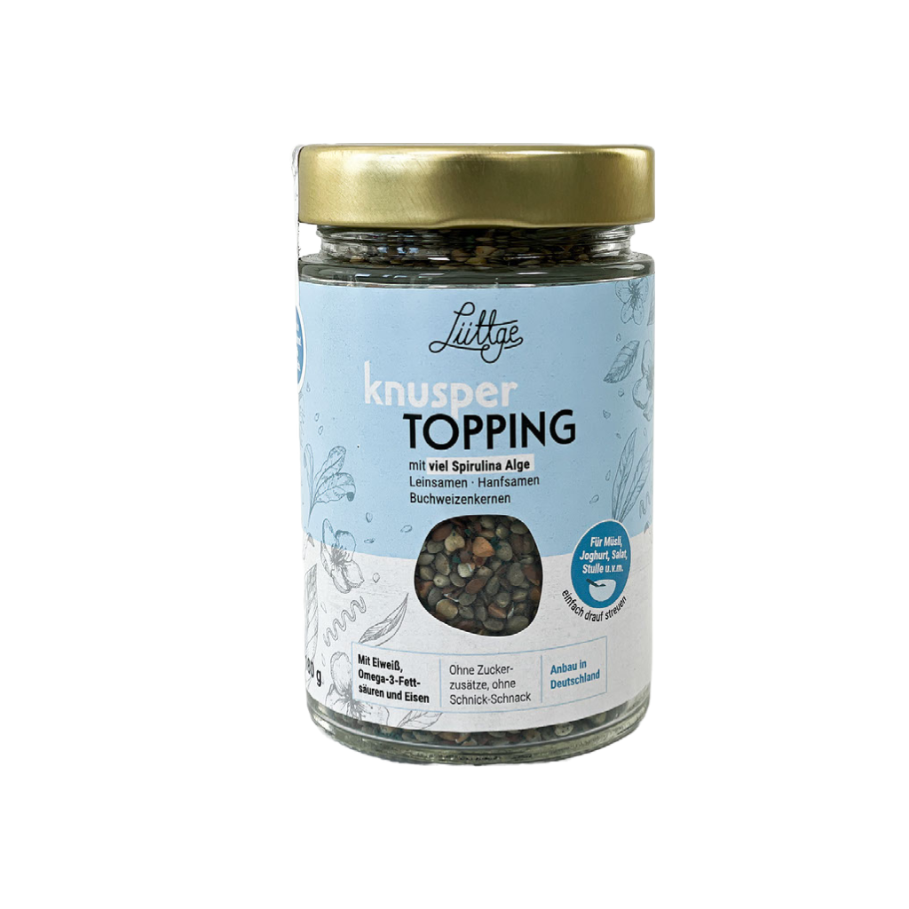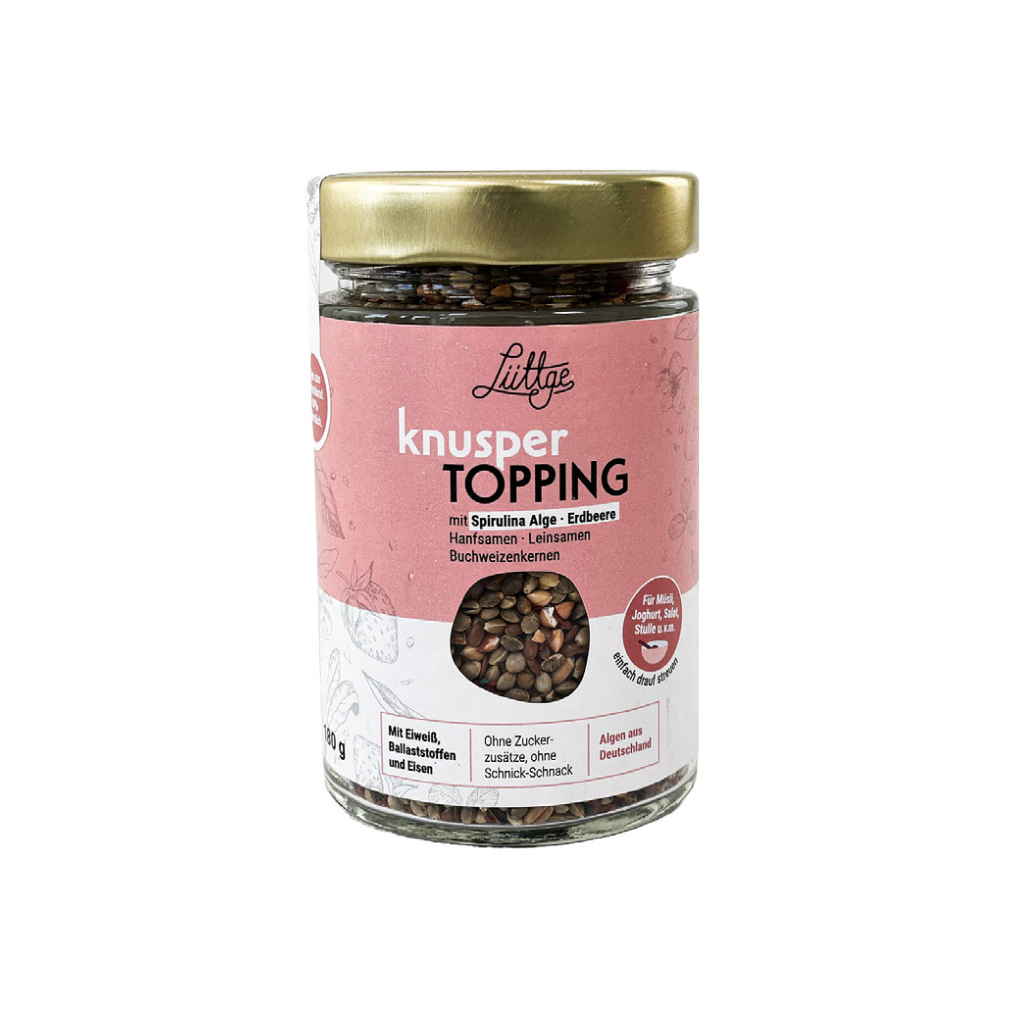 Unsere neuen Knusper Toppings sind der Kracher im Müsli oder Porridge. Die Toppings mit viel Spirulina Alge und weiteren Zutaten wie Leinsamen, Hanfsamen, Buchweizenkerne und Beeren sind eine natürliche Quelle für Ballaststoffe, Spurenelemente und Omega-3-Fettsäuren.