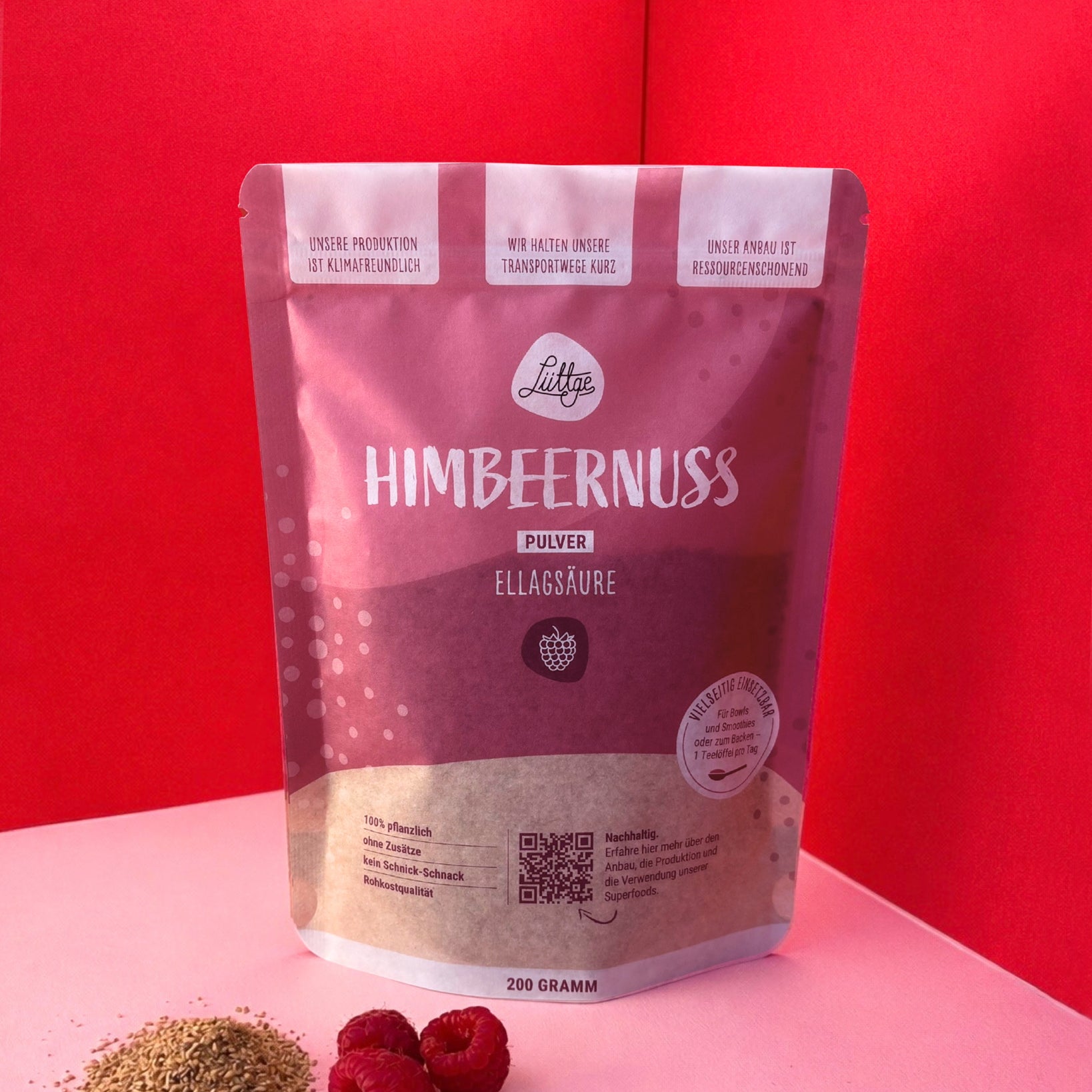 In ihnen befindet sich der wertvolle Inhaltsstoff Ellagsäure. Ellagsäure gehört zu der Gruppe der Phenolsäuren; diese sind ausschließlich in Nüssen und Früchten enthalten. Neben der wertvollen Ellagsäure punktet Lüttge Himbeernuss mit einem hohen Gehalt an Ballaststoffen und mehrfach ungesättigten Fettsäuren.