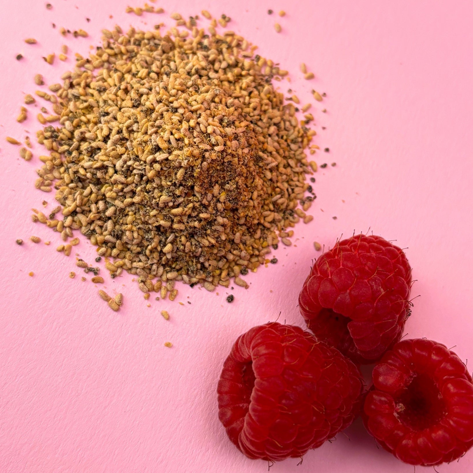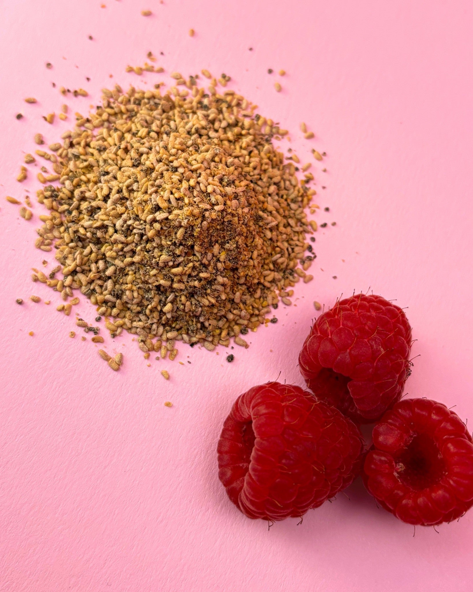 Himbeernüsse, das sind die kleinen Samen der Himbeere, die der Frucht ihre wellige Struktur geben. Strenggenommen ist die Himbeere keine Beere, sondern eine Sammelsteinfrucht. Eine einzelne Himbeere besteht aus vielen kleinen Steinfrüchten mit eigenem Kern. Das erklärt, warum Himbeeren so viele Kerne enthalten. Und an genau die wollen wir ran! Dafür trennen wir die Himbeernüsse vom Fruchtfleisch. Anschließend werden die kleinen Samen schonend getrocknet und gemahlen.