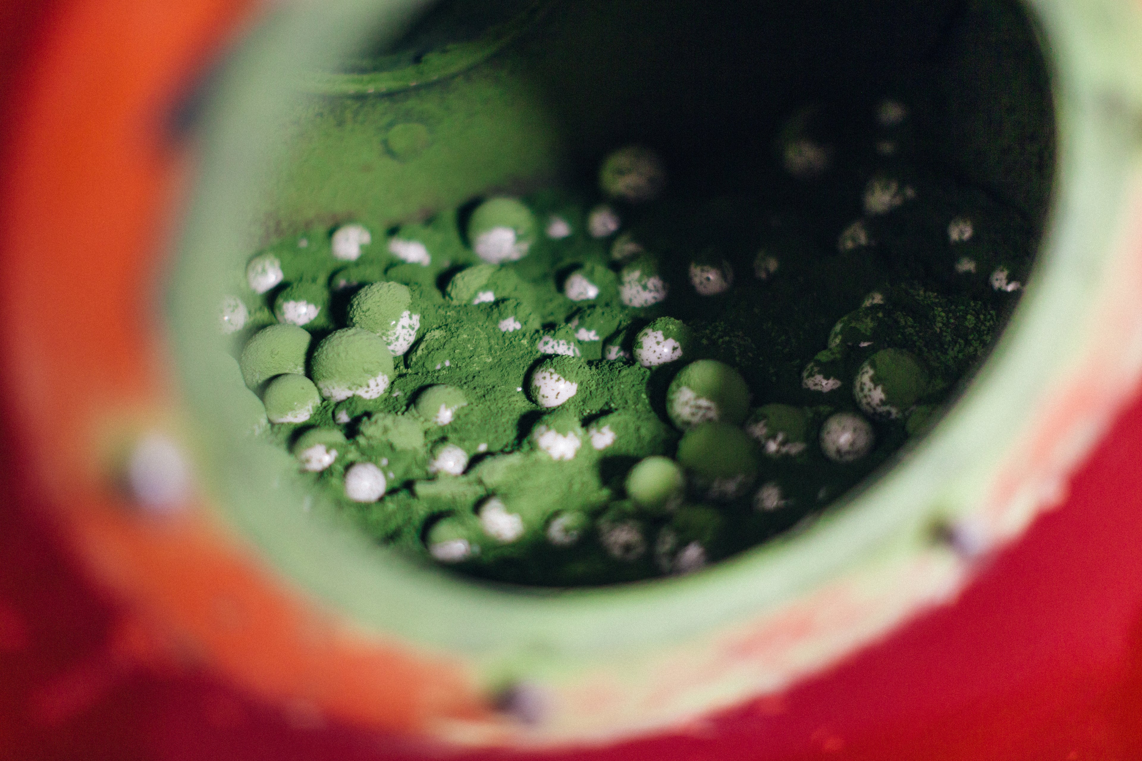 Nachdem die Alge ihre Feuchtigkeit verloren hat, wird sie entweder zu Chips gebrochen oder zu Pulver und Krümeln weiterverarbeitet. Mit unserer speziell entwickelten Kugelmühle ist es möglich, die Krümel schonend zu dem feinen Pulver zu vermahlen.